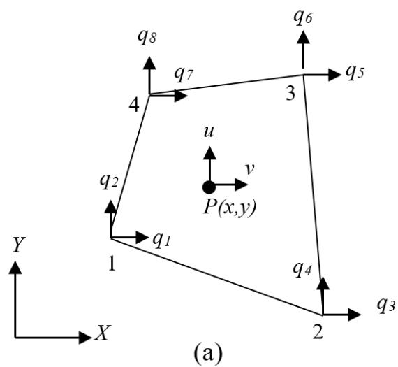 A general quadrilateral element is considered as shown in Figure 1(a), which has local nodes numbered as 1, 2, 3 and 4 in a counterclockwise fashion and $(x_{i},y_{i})$ are the coordinates of node $i$. The vector $\{q\} = [q_1,q_2,\dots \dots q_s]^T$ represents the element displacement vector. To develop the shape functions, a master element is considered (Figure 1(b)) having a square shape and being defined in $\xi$ -, $\eta$ - coordinates (or natural coordinates). The Lagrange shape functions, where $\mathrm{i} = 1,2,3$ and 4, are defined such that $\mathbf{N}_{\mathrm{i}}$ is equal to unity at node i and is zero at other nodes. In particular: