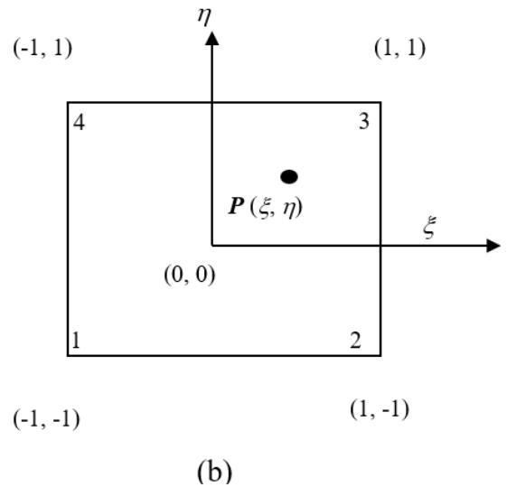 b) The quadrilateral element in $\xi$, $\eta$ space (master element)