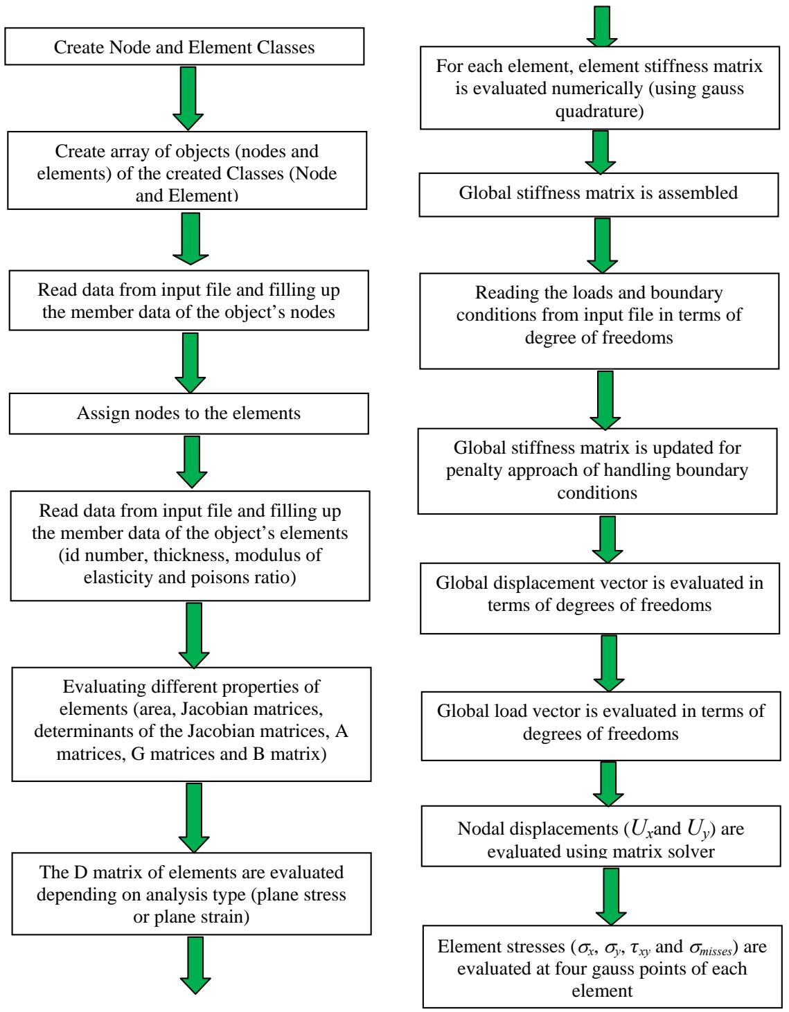 Nevertheless, it is also mentioned that triangular elements, especially those with higher-order displacement assumptions, can deliver acceptable accuracy and convergence characteristics. However, a notable drawback of triangular elements is the potential for mesh locking due to material incompressibility. This issue represents a significant limitation when employing triangular elements in certain applications. A brief overview of the object-oriented code utilized in this research is presented here.