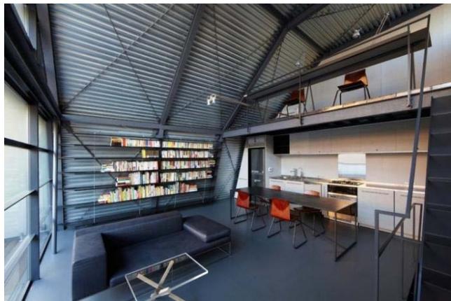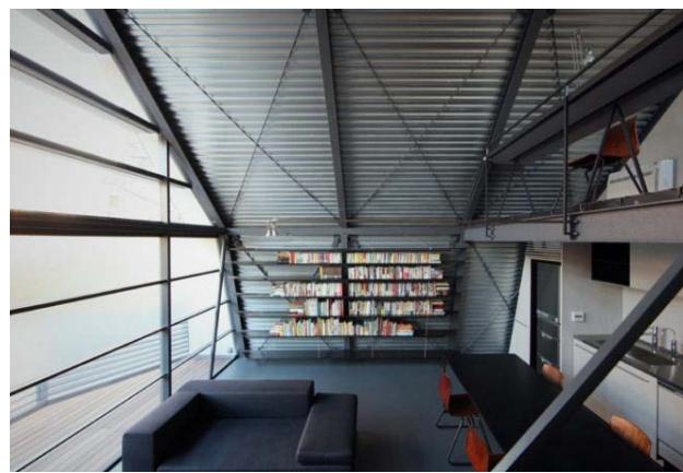 Fig. 3: Mishima House by Keiji Ashizawa Design (2010) Despite being located in the centre of Tokyo, the apartment provides privacy for the owners, as all private rooms are located on the closed lower floors, while the living room, library, and study are located on the third level and, although they have large panoramic windows, frosted glass protects the residents from excessive attention from the outside world. The severity and restraint of the interior is emphasised by the steel beams under the ceiling, dark grey colour scheme with red accents.