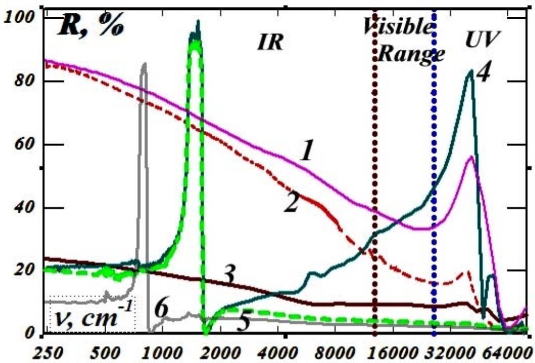 But since the parameters of the crystal lattices of the rhombohedral phases of boron nitride and graphite are very close, the highly ordered boron nitride of the rhombohedral phase is an ideal environment (support) for the existence of atomic-thick graphite layers. Boris Nikolaevich Sharupin grew crystals of highly ordered boron nitride containing very thin graphite layers [9, 10]. The samples were slightly cloudy when viewed through the light, since the thinnest graphite layers in boron nitride were in the form of millimeter-diameter spots. Individual thin layers of graphite naturally transmitted visible light, but since the real part of the permittivity of graphite is much greater than its imaginary part, then in aggregate, due to the interference of reflections of the thinnest layers of graphite, they give a mirror metallic reflection of visible light from the plane of the crystal, perpendicular to the C axis and practically did not reflect visible light from the plane parallel to the C axis - they were completely black for any polarization (Fig. 6). This led to a gigantic spatial dispersion in the visible region of the spectrum. As shown in Fig. 6, in the IR range, the lattice peaks of reflection of boron nitride with graphite inclusions with polarization perpendicular to the C axis are practically independent of the orientation of the wave vector (curves 4 and 5). And the anomalously large "silver" reflection in the visible range of the spectrum of boron nitride samples with graphite inclusions from the plane perpendicular to the C axis (Fig. 6, curve 4) and, thus, the giant spatial dispersion (Fig. 6, curve 5) are associated with a powerful diffraction maximum of reflection in the ultraviolet region of the spectrum, which, in frequency, corresponds to local plasma oscillations in graphite patches with a diameter of about $50\mathrm{nm}$.