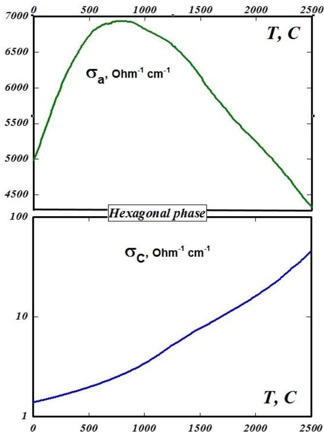 Fig. 5: Temperature dependences of the specific electrical conductivity of ordered hexagonal graphite in the plane of the hexagons (a - from above) and along the C axis (from below)