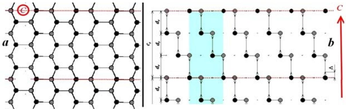 In this case, the degree of ordering of the crystal lattice in Fig. 1 was determined, as described earlier, by the blurring of the translation parameters, both in the plane of the hexagons and along the C axis. In parallel to graphite, pyrocrystals of its dielectric analogue, boron nitride, created by B.N. Sharupin, were studied [7]. As studies have shown, a decrease in anisotropy at a very high degree of ordering of pyrocrystals is associated not only with the ordering of their microstructure, but with the order-disorder transition in the distribution of interlayer bonds in the crystal lattice [8]. The transition from chaotically distributed interlayer bonds to strictly ordered ones determines, both in graphite and in boron nitride, the phase transition from the hexagonal phase, with a period of translation of monatomic layers along the C axis equal to twice the interatomic distance, to the highly ordered rhombohedral phase with a period of translation of monatomic layers equal to three times the interatomic distance (Fig. 2).
