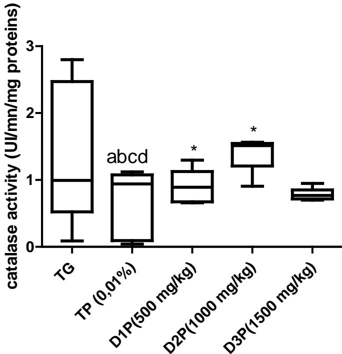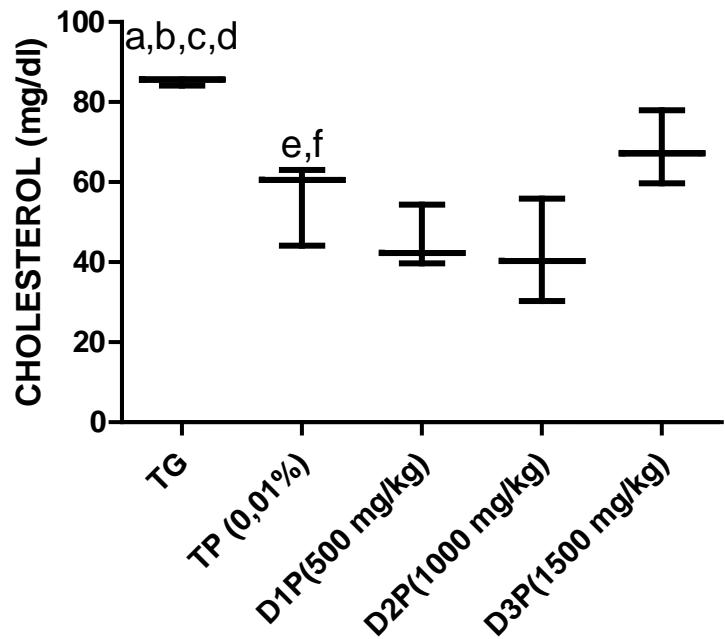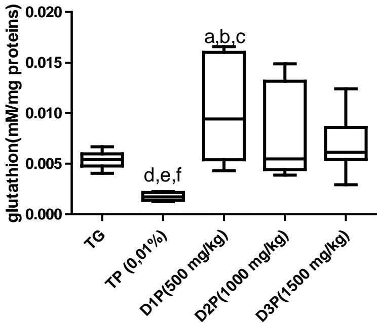 The values are expressed as mean $\pm$ SD. TG: Control group rats with food and water ad libitum, TP: stressed rats without treatment, D1P: dose of 500 mg/kg, D2P: dose of 1000 mg/kg, D3P: dose of 1500 mg/kg. a, b,c, d statistically different mean compared to TP, D1P, D2P and D3P at $p < 0.05$ (LSD test) e, f mean statistically different from D1P and D3P at $p < 0.05$ (LSD test)