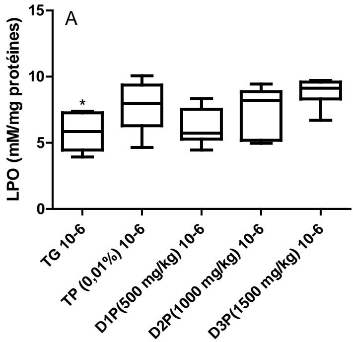 - The values are expressed as mean ± SD. TG: Control group rats with food and water ad libitum, TP: stressed rats without treatment, D1P: dose of 500 mg/kg, D2P: dose of 1000 mg/kg, D3P: dose of 1500 mg/kg.