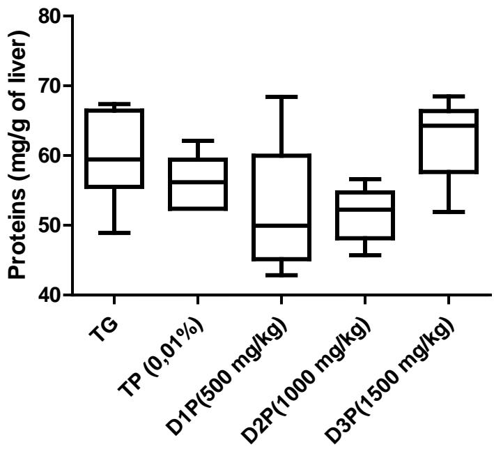 Results also have shown no significant difference in the amount of protein in the liver (figure1). Regarding lipid peroxidation (figure 2), results show no significant difference in the concentration of peroxidized lipids between the groups except between the unstressed control group (TG) and the $1500\mathrm{mg / kg}$ dose group where the concentration was $34\%$ higher. These results are not in agreement with those of Mladenovic et al, (2013); Patere et al, (2011); Johnsen et al, (2007). The effect of FMP16 on oxidative stress enzymes such as catalase and cellular glutathione was also studied. Our results showed an increase in catalase activity of $87\%$, $85\%$, $90\%$, $82\%$ respectively for the TG, D1P, D2P and D3P groups compared to the TP group (intoxicated and untreated). Also, catalase activity of the $1000\mathrm{mg / kg}$ dose (D2P) was $35\%$ and $43\%$ higher respectively compared to the 500 and $1500\mathrm{mg / kg}$ doses (figure 3 and 4). These results corroborate those of Lamou et al, (2015); Pornariya and Kanok, (2009); Elmastas et al, (2007); Mishra et al, (2011) and, they would be justified by the antioxidant capacity of both Moringa oleifera and Pleurotus ostreatus (Zhang et al., 2016; Elmastas et al., 2007; Makkar et al., 1996; Sholapur and Patil, 2013).