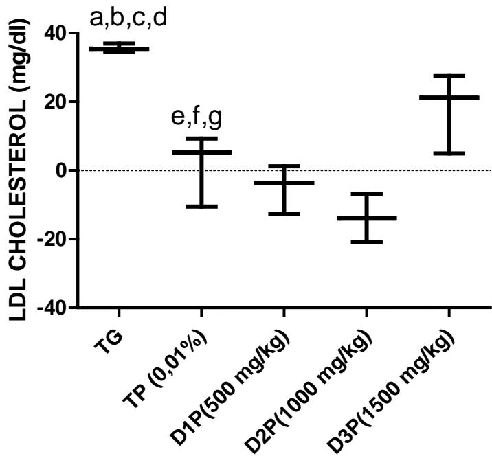 The values are expressed as mean $\pm$ SD. TG: Control group rats with food and water ad libitum, TP: stressed rats without treatment, D1P: dose of 500 mg/kg, D2P: dose of 1000 mg/kg, D3P: dose of 1500 mg/kg. a,b,c,d statistically different mean compared to TP, D1P, D2P and D3P at $p < 0.05$ (LSD test) e, f, g mean statistically different from D1P, D2P and D3P at $p < 0.05$ (LSD test)
