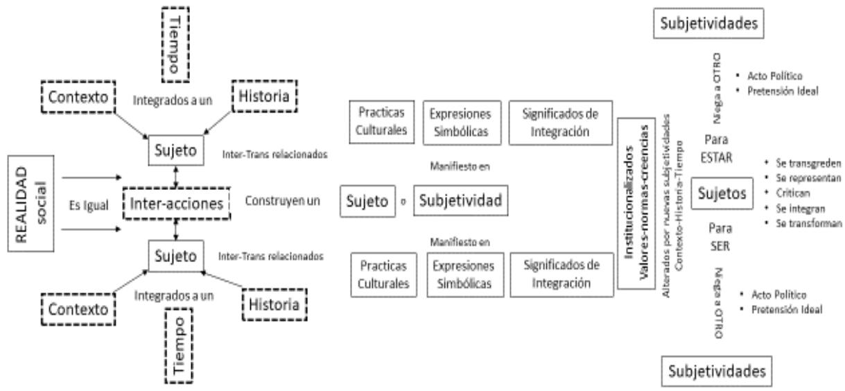 - La inter y trans relación de las subjetividades, siempre muestra cambios significativos latentes, proceso que permite socialmente a los actores particulares posibiliten su permanencia (reproducción), trascendencia (cambio) o negación (transformación propositiva), pero siempre en relaciones y transmutación dialéctica constante.