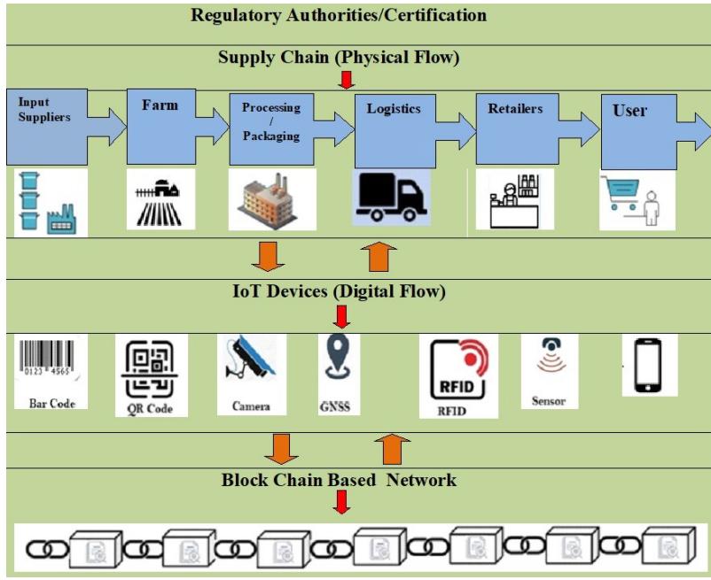 Blockchain technology is mainly known for its application in cryptocurrency finance (BitCoin). However, the agricultural world is beginning to recognize this innovative new technology from a different perspective. Blockchain technology could include producers, retailers, logistics providers, and regulators in any supply chain. Blockchain technology based trading platforms reform agricultural trade by transparently connecting each transacting client to the same dataset (intellias.com). Block Chain technology aims to reduce transaction costs and establish financial security. Blockchain technology simplifies and reduces the cost of validation and monitoring in the supply chain, (Fig. 8) which in turn, encourages smaller suppliers in the global food economy. Blockchain technology can transform the supply chain mechanism in the agricultural industry (intellias.com).