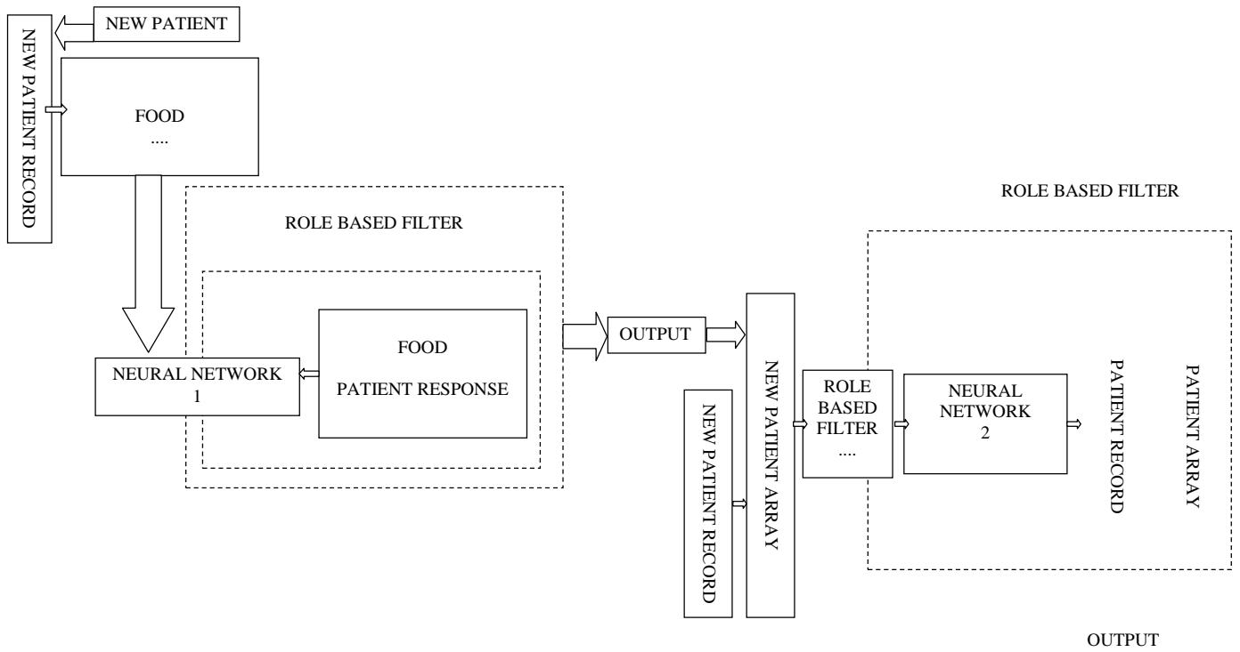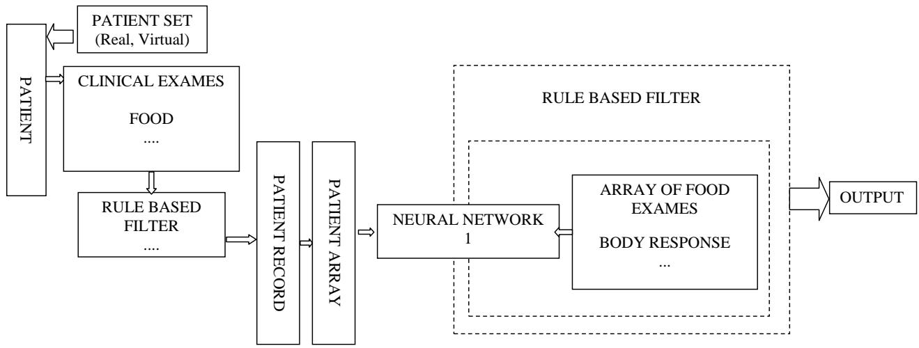 The information and the result of the correct training of the NN $n^{\circ}1$ of the successful learning of the diet-patient pairing; and up to this point after having carried out the training: then an average of the input vectors of the arrays of the patients and their diets is made and the significant food could be hidden, in truth the input of interest appears: then a new case is presented and at this point the network will say the most mylinizing diet and the difference is made between the representative vector of the new case minus the average of the patients, then we will see what are the variables in play that determine this difference between the representative vectors. The schemes proposed in fig. 1 and 2 should be considered a common place that can also be used for other pathologies, this aspect is very important to underline.