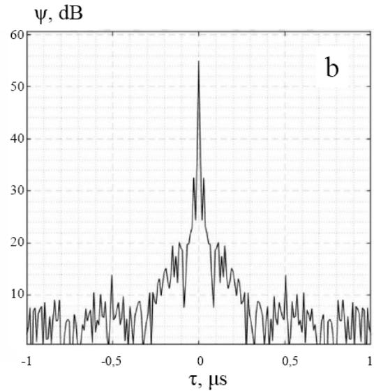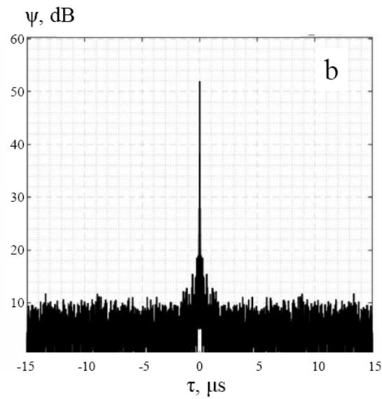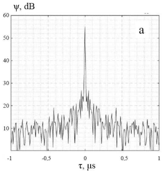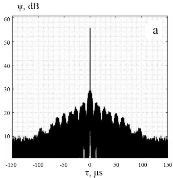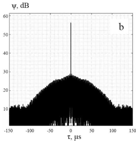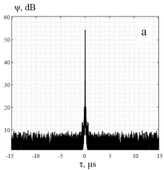 Fig. 1, a demonstrate as a reference, the average ACF of the radio emission of the clear sky, the level of which is about 8 dB less than the level of the radio emission of the Sun. The ACF of the Sun's radio emission in the complete absence of clouds is shown in Fig. 1,b.
