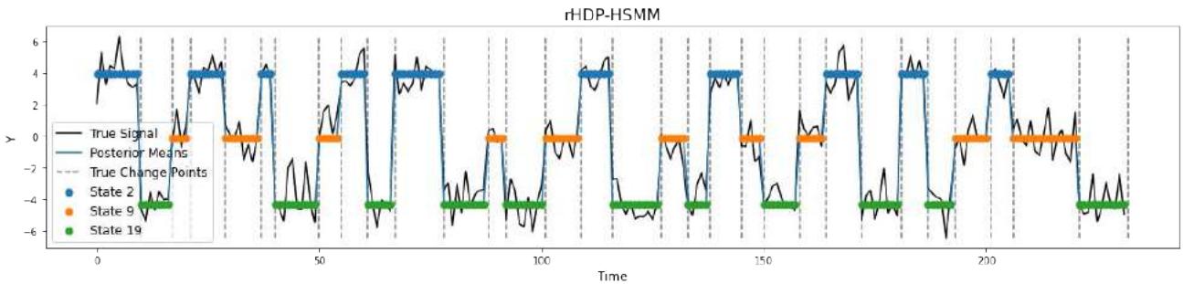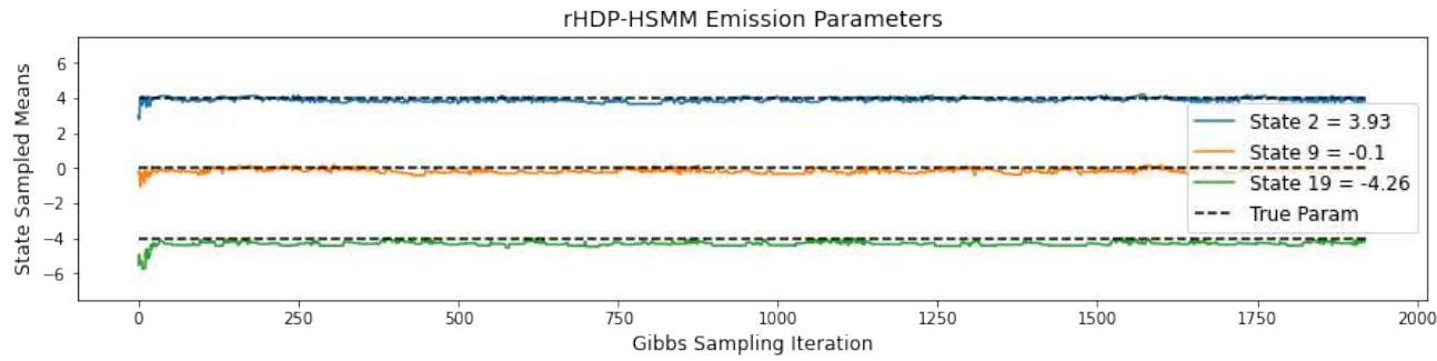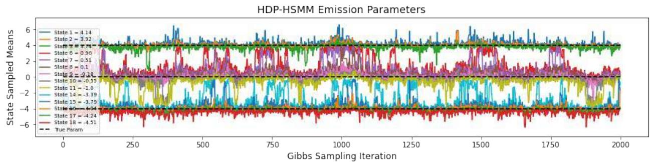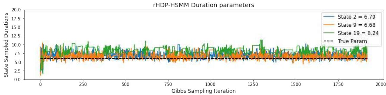 HDP-HSMM and rHDP-HSMM's emission distribution convergence. The states shown in the plots are the states appearing in the final learned state sequence for each model. Each state is indicated by a different color. The true parameters are indicated by the dashed lines. While both models' posteriors are concentrated around the true parameters, the HDP-HSMM's posterior is multimodal for many states. Figure 4a shows how the many states rapidly switch which true state they want to encapture across sampling iterations. With regards to the duration, Figure 5 displays how both models posteriors are concentrated near the true duration. However, the variance of the HDP-HSMM's posterior samples is far larger than the variance of the rHDP-HSMM. This could be due to a large variation of samples being allocated to each state in the HDP-HSMM. To see this, Figure 6 shows the posterior state sequence estimated by both models. While the rHDP-HSMM distributes samples to each state under the constraint of removing redundant states, the HDP-HSMM's redundant states leave many states with very few samples left to estimate their duration. On a more positive note, both models are able to capture most of the true change points, however the HDP-HSMM leaves an impression of many more change point occurrences. Meanwhile, rHDP-HSMM clearly separates each of the 3 states from one another and captures only the locations of the true change points in the data.