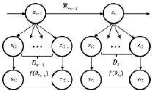 z_{s} \sim \bar{\pi}_{z_{s-1}}\quad D_{s} \sim g(\omega_{z_{s}})\quad s = 1, 2, \dots ,\tag{1}