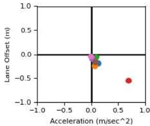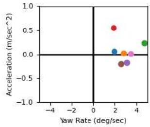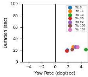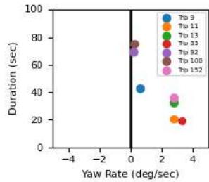 The learned states from each model which occurred on the marked portion are analyzed in Figure 9. Figures 9a and 9b show the emission means and durations learned by the HDP-HSMM and the rHDP-HSMM respectively. Interestingly, Figure 9b shows how the rHDP-HSMM concentrates the emission means in various quadrants of the graph. These quadrants relay a positive yaw rate, a negative lane offset, and a positive acceleration in all the learnt means. The concentration of these means in each quadrant indicate a consistency in maneuvers among the various trips, which translates to a left turning action intended by the driver. This same conclusion is not easily recognizable in Figure 9a, as the HDP-HSMM loses this consistency in the learnt means. The difference in learning procedure between the HDP-HSMM and the rHDP-HSMM suggests that the HDP-HSMM's lack of concentrated means derives from the HDP-HSMM overestimating the number of states. As the rHDP-HSMM inference procedure merges similar states together, the emission means of each state can be inferred with a greater amount of data, providing both more consistent estimates and more consistent conclusions.