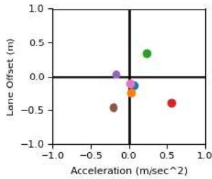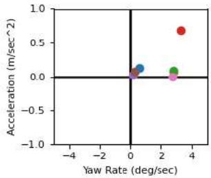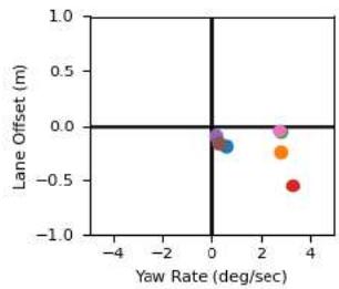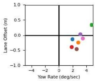 The kinematic signals of interest are acceleration, lane offset, and yaw rate. Acceleration and lane offset reflect a driver's intention of moving in the longitudinal and lateral directions respectively. Yaw rate captures a driver's intention of changing the forward direction of the car. Together, they form a multivariate time-series sampled at $10\mathrm{Hz}$ which should be highly correlated with human-driving behaviors. An example of the collected signals is