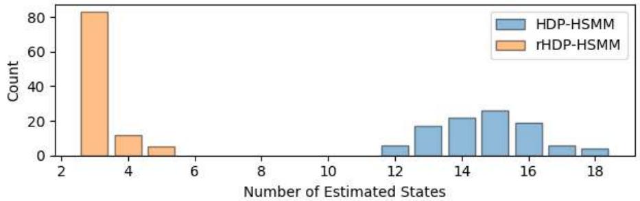 Figure 7: The Number of Estimated States from 100 Simulations Comparing both a HDP-HSMM and the rHDP-HSMM