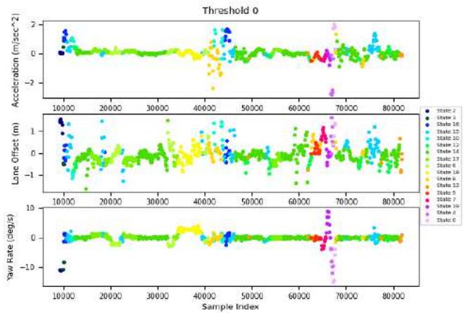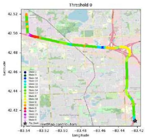 (b) Figure 1: An Example Trip and the Kinematic Signals Belonging to it. Learned States from an HDP-HSMM are Color Coded as Labels While the HDP-HSMM is powerful, literature outside of the field of transportation details how the model's use of an HDP prior can lead to redundant and inconsistent state estimations. This detail is important as it needs to be considered by researchers attempting to utilize the HDP-HSMM to describe driving styles. For example, Figure 1 clearly has redundant states as seen by the green shaded states. The redundant states can make analysis of HDP-HSMM outputs across multiple datasets difficult for researchers hoping to utilize the HDP-HSMM to model driving styles. This paper addresses this issue by presenting an algorithm that reduces redundant states to improve consistency while still aligning to the structure of a basic HDP-HSMM. The presented algorithm results a more robust HDP-HSMM (rHDP-HSMM) that is expected to output a more consistent data segmentation, behavior state duration, and state transition probabilities than a basic HDP-HSMM. This will impact the transportation field in that driving maneuver patterns can be better grouped together for classification or behavioral studies.