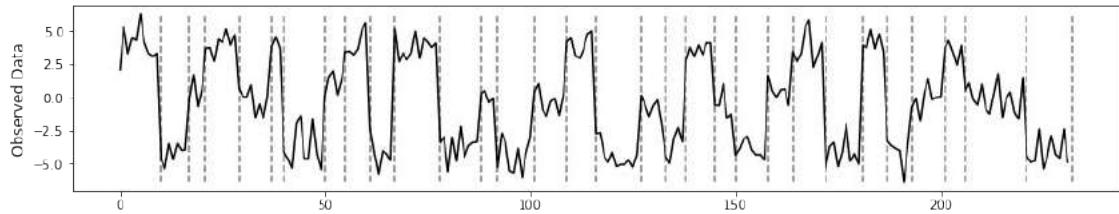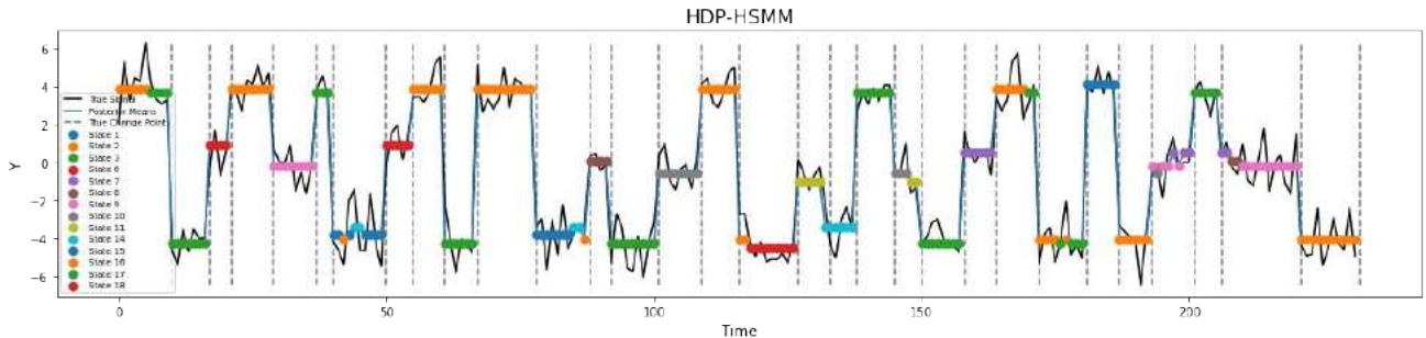 Table 3 shows that the rHDP-HSMM converged on average with fewer iterations than the HDP-HSMM. This table also shows that while both models are able to correctly capture all the true change points, the standard HDP-HSMM tends to estimate many more change points than the rHDP-HSMM. This is due to the redundancy issue, which the rHDP-HSMM eliminates through its modified inference procedure.