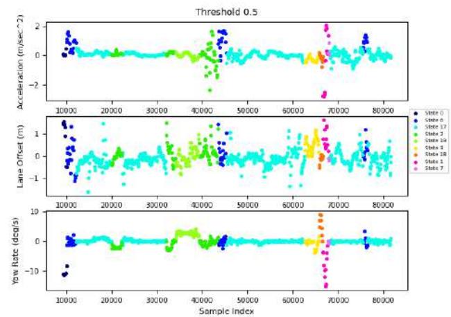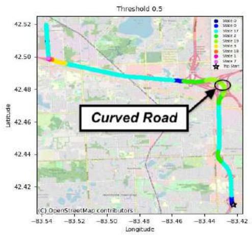 The colors in Figure 8 represent the labeling results after training the 0.5 threshold rHDP-HSMM. Noticeably, the rHDP-HSMM segments the road into 9 states. Looking deeper at Figure 8b, it is clear that each state is primarily dictated by changes in yaw rate. Hence this model is able to capture portions of the road where various turning maneuvers are intended by the driver (Figure 8a). Comparing Figure 8a with the HDP-HSMM segmentation shown in Figure 1a, it is clear how the rHDP-HSMM merged the HDP-HSMM's 17 states into a more clear representation of maneuvers used on the road.
