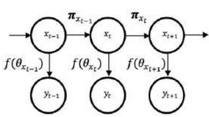 The HDP-HSMM was designed to improve upon the structure of a discrete state-space Hidden Markov Model (HMM). HMM's are also popularly used for describing sequential data [7, 8, 9, 10, 11, 12]. In particular, the HMM [13, 14] utilizes a two-layer structure (Figure 2a) to represent sequential data observed at equally spaced time points. In this model, data is assumed to be generated from a set of probability distribution functions dependent on corresponding hidden states. The hidden states determine the data segmentation. Transitions among hidden states are modeled as a Markov Chain. This allows for the consideration of time sequence information during inference and further aids in the prediction of future states. One condition of using the Markov Chain is that the state duration of each hidden state is assumed to be Geometrically distributed.