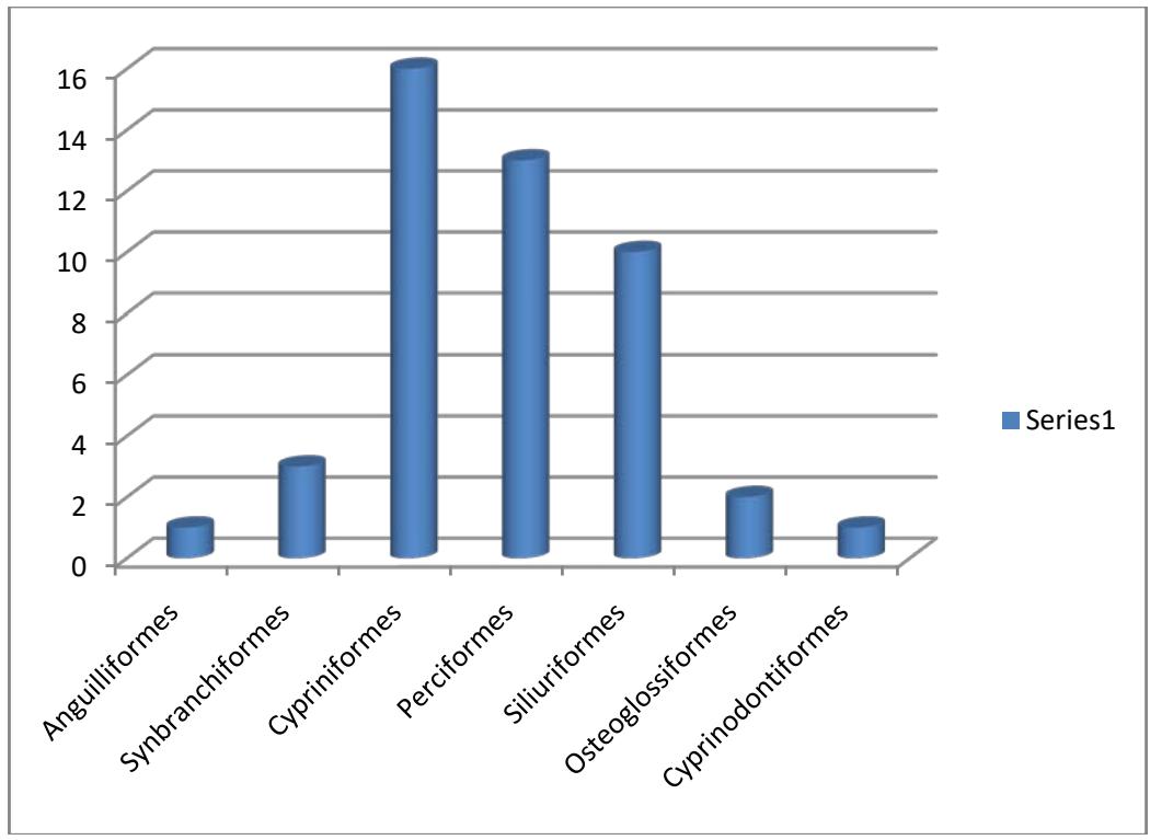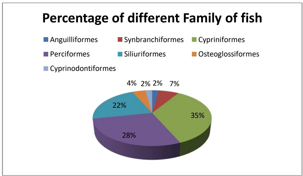 Among all these, order Cypriniformes was the most dominant constituting $35\%$, followed by the order Siliuriformes which includes $22\%$, order Perciformes, Synbranchiformes, Osteoglossiformes, Anguilliformes and Cyrinodontiformes comprised $28\%$, $7\%$, $4\%$, $2\%$ and $2\%$ respectively.