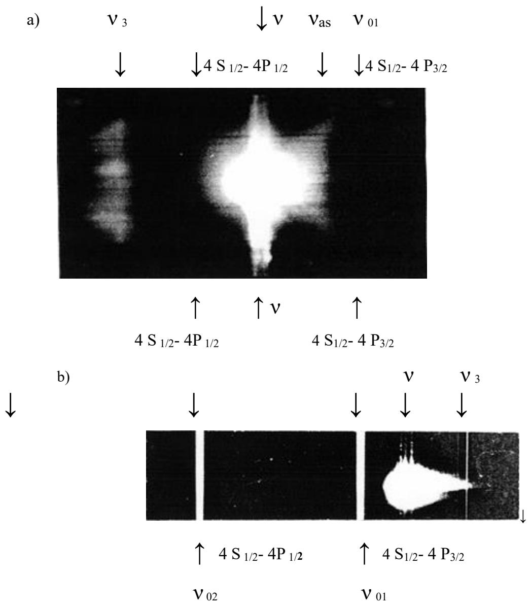 $v_{3} = 2\nu - v_{01}$ (the value of $2\nu$ reflects the process of annihilation of two photons with the formation of an axion, during the decay of which photons appear at the frequency $v_{3}$ ). The reference lines of the doublet $v_{02}, v_{01}$ on the spectrogram 1 b) were obtained using a spectral lamp. In the second spectrogram (Fig. 1b), the pump radiation frequency $\nu \approx 13070\mathrm{cm}^{-1}$ is shifted to the anti-Stokes region relative to the frequency of the transition line $4S_{1/2} - 4P_{3/2}$. In this case, we have a broadening of the frequency spectrum. On a spectrogram with a shift to the high-frequency region of the spectrum relative to the pumping frequency $-\nu$, a weak line of resonant electron forced raman scattering (EFRs) is also recorded at the output of the cuvette, the frequency of which is indicated by $\nu_{3}$.
