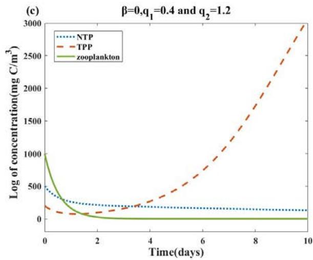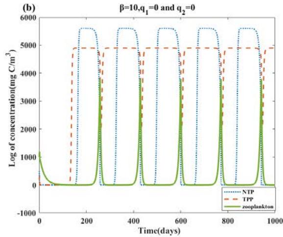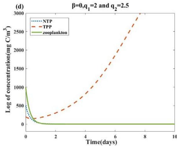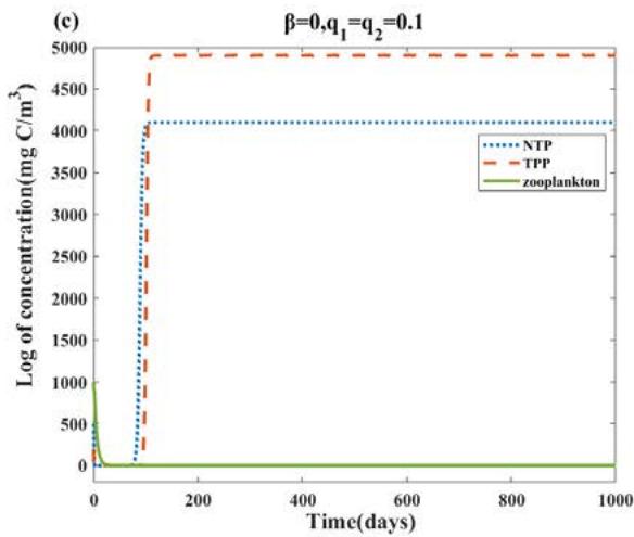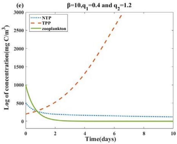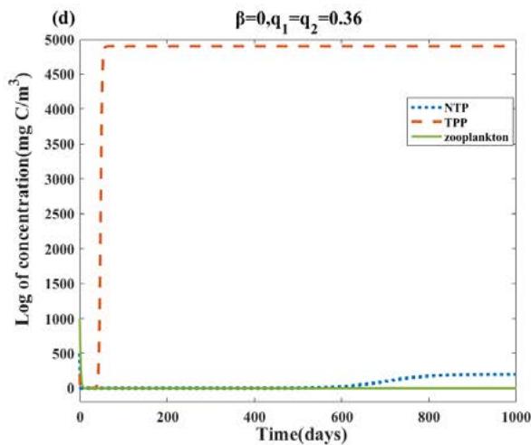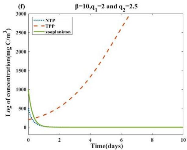 Fig. 4: The long-term dynamics of the system (2.1), all other parameter values are the same as Table 2. (a): When $q_{1} = q_{2} = 0$, NTP and zooplankton with initial concentrations (500,200,1000) oscillate and TPP populations become extinct. (b): For $\beta = 10$, all populations survive and the system stabilizes to a limit cycle. (c)(d): For $\beta = 0$, $0 \leq q_{1} = q_{2} \leq 0.36$, NTP and TPP can coexist. (e)(f): when we fix $\beta = 10$ and increase $q_{1} = q_{2} = 0.36$ to $q_{1} = q_{2} = 0.37$, we will find that the coexistence of NTP and TPP disappears, and then only TPP exists and tends to be stable, while NTP and zooplankton tend to be extinct.