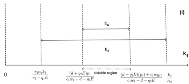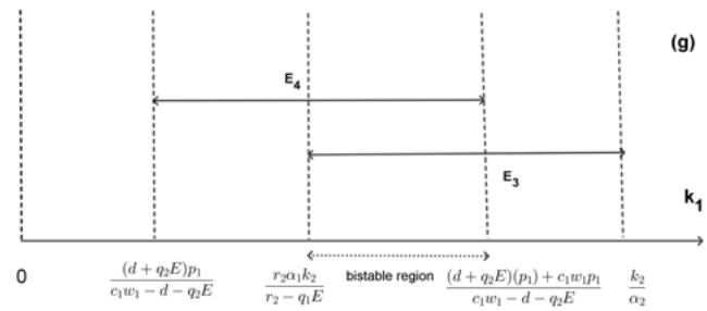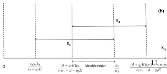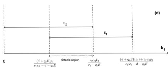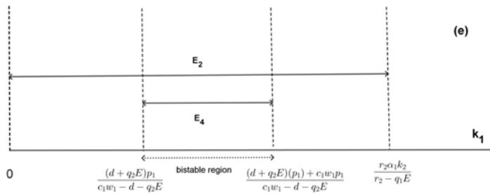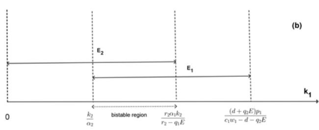 The existence and stability of these equilibrium points are summarized in Table 1 and Fig 1. When $c_{1}w_{1} - d - q_{2}E > 0$, equilibria $E_{2} = (0,k_{2},0)$, $E_{3} = (\widehat{N},\widehat{T},0)$, $E_{1} = (k_{1},0,0)$ and $E_{4} = (\bar{N},0,\bar{Z})$ keep stable for $(0 < k_{1} < \frac{r_{2}\alpha_{1}k_{2}}{r_{2} - q_{1}E})$, $(\frac{r_{2}\alpha_{1}k_{2}}{r_{2} - q_{1}E} < k_{1} < \frac{k_{2}}{\alpha_{2}})$, $(\frac{k_{2}}{\alpha_{2}} < k_{1} < \frac{p_{1}(d + q_{2}E)}{c_{1}w_{1} - d - q_{2}E})$ and $(\frac{(d + q_2E)p_1}{c_1w_1 - d - q_2E} < k_1 < \frac{(d + q_2E)(p_1) + c_1w_1p_1}{c_1w_1 - d - q_2E})$, respectively(Fig.1(a)). Obviously, for $k_{1}$ at the different equilibria above, the coexistence of NTP, TPP, and zooplankton requires the three ranges $(k_{1} > \frac{r_{2}\alpha_{1}k_{2}}{r_{2} - q_{1}E})$, $(k_{1} < \frac{k_{2}}{\alpha_{2}})$, and $(k_{1} > \frac{(d + q_{2}E)p_{1}}{c_{1}w_{1} - d - q_{2}E})$, respectively. Therefore, the system exhibits these three possible types of bistability, where