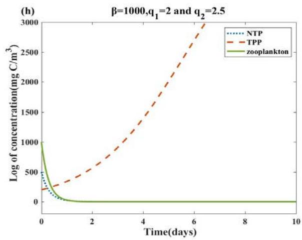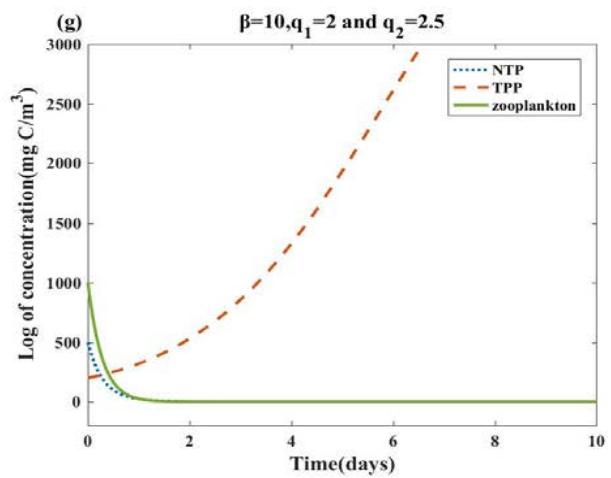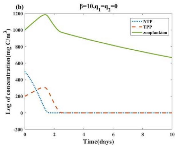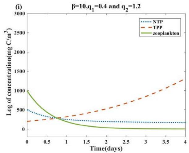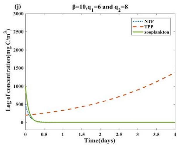 Fig. 3: The dynamic changes of the system (1) with different $\beta$, $q_{1}$ and $q_{2}$ in the first 10 days, other parameter values and initial conditions are the same as Table 2. (a)(b): In the case of $q_{1} = q_{2} = 0$, $\beta = 0$ and $\beta = 10$, the TPP concentration will fluctuate and the NTP concentration will barely change. (c)(d): For $\beta = 0$, the concentrations of $q_{1}$ and $q_{2}$ increase, and both NTP and TPP concentrations accelerate towards extinction. (e)(f): Based on (c)(d), for $\beta = 10$, TPP reached a higher flowering concentration, while NTP still maintained a lower concentration. (g)(h): Based on (f), for $\beta = 1000$, NTP and TPP concentrations are almost unchanged. (i)(j): for $\beta = 10$, we increase the concentrations of $q_{1}$ and $q_{2}$ to 6 and 8, respectively. NTP and zooplankton accelerate the decline rate, while TPP has no obvious change.