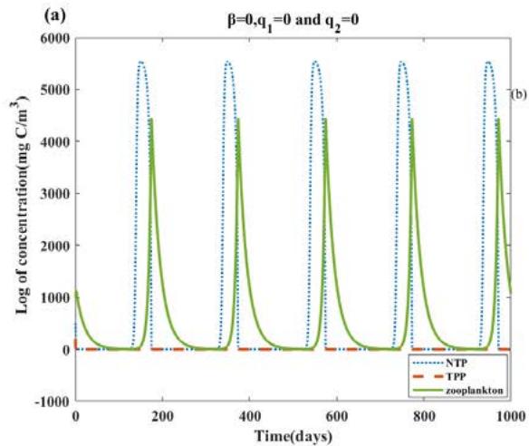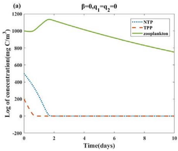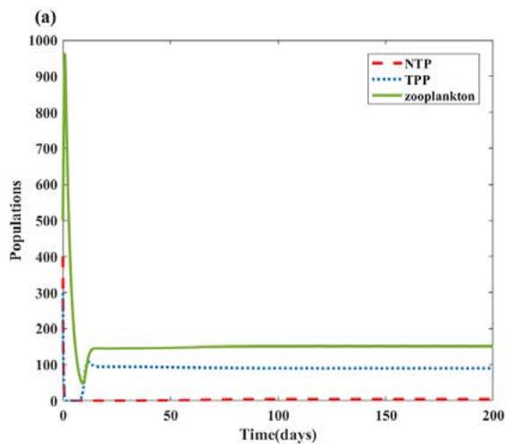 (iv) $E_3$: When the carrying capacity of NTP population $(k_{1})$ remains within two threshold values $\frac{r_2\alpha_1k_2}{r_2 - q_1E} < k_1 < \frac{k_2}{\alpha_2}$ (it can be obtained by the threshold value $(k_{1})$ of $E_{1}$ and $E_{2}$ ) together with the competitive effects $(\alpha_{1},\alpha_{2})$, the harvesting term on NTP $(q_{1}E)$ are present and the values of all three are small, the zooplankton population will go extinct on the condition that $\frac{c_1w_1\hat{N}}{p_1 + \hat{N}} -d - q_2E < \frac{c_2w_2\hat{T}}{p_2 + \hat{T} + \beta\hat{N}}$, whereas both NTP and TPP persist in the system. The chance of zooplankton extinction increases with the decrease in avoidance of TPP by zooplankton $(\beta)$, TPP consumption rate $(w_{1})$, the half-saturation constant for TPP $(p_2)$, the harvesting term on zooplankton $(q_{2}E)$ and the zooplankton mortality $(d)$. For a specific parameter setup $\left(\frac{c_1w_1\hat{N}}{p_1 + \hat{N}} -(d + q_2E) > 0\right)$, we can find a threshold value of the avoidance of TPP by zooplankton $(\beta < \frac{(c_2w_2\hat{T})(p_1 + \hat{N})}{(\hat{N})(c_1w_1\hat{N} - (d + q_2E)(p_1 + \hat{N}))} -\frac{p_2 + \hat{T}}{\hat{N}})$, below which the zooplankton population will become extinct. On the contrary, for $\frac{c_1w_1\hat{N}}{p_1 + \hat{N}} -(d + q_2E) < 0$, the extinction of zooplankton dose not depend on the intensity of avoidance; it maybe has something relationship with the harvest term on zooplankton $(q_{2}E)$.