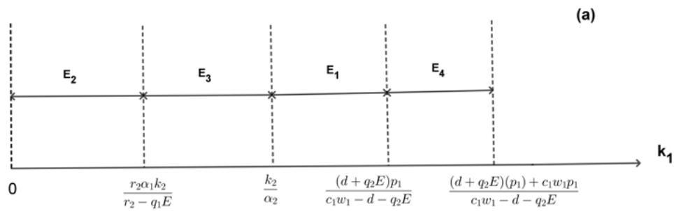 - (ii) $E_{1}$: From the analysis of research results, whenever the carrying capacity of the NTP population $(k_{1})$ stays within the specific threshold values of $\frac{k_2}{\alpha_2} < k_1 < \frac{p_1(d + q_2E)}{c_1w_1 - d - q_2E}$, both TPP and zooplankton will eventually become extinct from the system. Now, through the analysis of the $k_{1}$ threshold range, as the intensification of the harvest for zooplankton, the equilibrium point $E_{1}$ remains stable for a more extensive range of $k_{1}$, and we can say that over-fishing of zooplankton $(q_{2}E)$ may accelerate the extinction of TPP and zooplankton.
