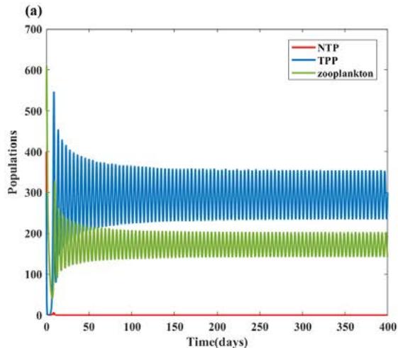 - (ii) The eigenvalues of the TPP and zooplankton-free equilibrium $E_{1} = (k_{1},0,0)$ are $-r_{1} - q_{1}E$, $r_{2}(1 - \frac{k_{1}\alpha_{2}}{k_{2}})$ and $\frac{c_1w_1k_1}{p_1 + k_1} -d - q_2E$. When $c_{1}\omega_{1} - d - q_{2}E\leq 0$, and $\alpha_{2} > \frac{k_{2}}{k_{1}}$ hold, $E_{1}$ is LAS(locally asymptotically stable). On the contrary, if $c_{1}\omega_{1} - d - q_{2}E > 0$, $\alpha_{2} > \frac{k_{2}}{k_{1}}$ and $k_{1} < \frac{p_{1}(d + q_{2}E)}{c_{1}w_{1} - d - q_{2}E}$ hold, we can also obtain $E_{1}$ is LAS.