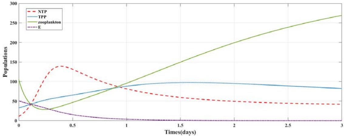 - (iii) $E_{2}$: If the carrying capacity of NTP population $(k_{1})$ stays below the threshold value $\frac{r_2\alpha_1k_2}{r_2 - q_1E}$, both NTP and zooplankton eventually extinct. With the competitive effect of TPP on NTP $(\alpha_{1})$, the environmental carrying capacities of toxin-producing phytoplankton $(k_{2})$ and harvesting term for NTP and zooplankton