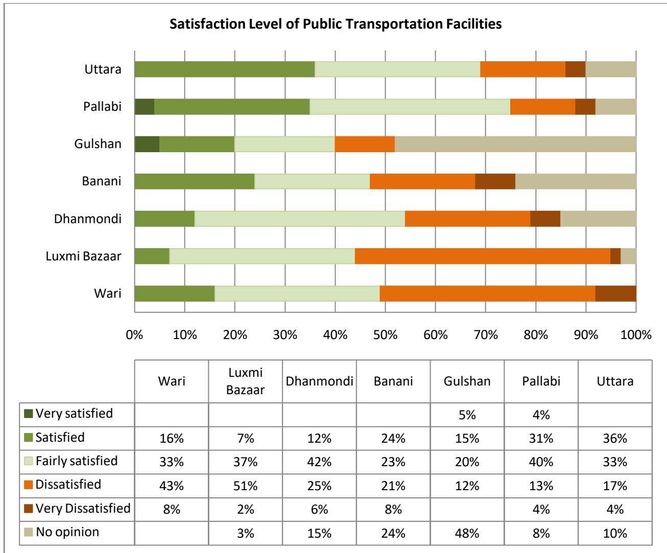 Regarding the satisfaction level of transportation facilities, Wari and Luxmi Bazaar display contrasting opinions from the respondents. Despite belonging to Old Dhaka, around $91\%$ of respondents of Luxmi Bazaar have expressed their satisfaction in various degrees, while in Wari only $51\%$ have shown positive remarks, and the rest are dissatisfied with the provision of public transport facilities. Both Wari and Luxmi Bazaar have one bus stop, but it takes comparatively less time to reach the bus stop in Luxmi Bazaar (5-10 mins). In the case of Wari, there is no bus stop within the neighborhood and the nearest bus stop is situated in Gulistan which takes around 15-20 minutes to reach. The distance and lack of bus stops and vehicle occupancy rate are significant factors for the higher rate of dissatisfaction in Wari as asserted by some of the respondents: