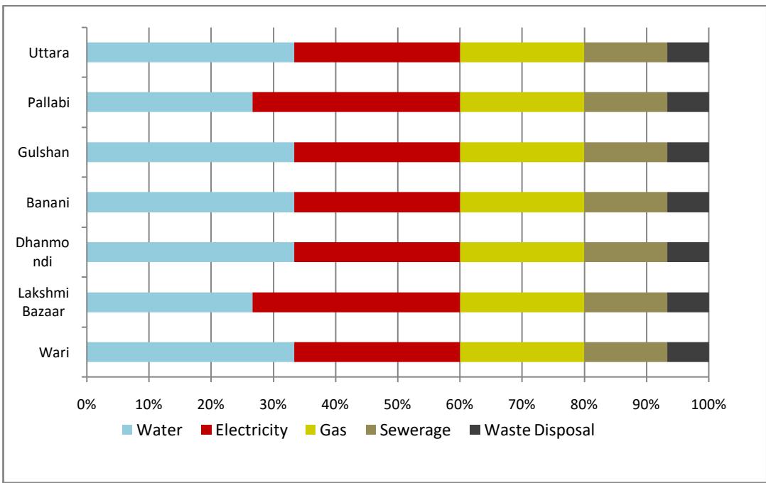 On the other hand, the residents of Luxmi Bazaar and Pallabi have reported having better service regarding electricity supply than water. This may be attributed to the presence of fewer large-scale shopping malls and other commercial facilities in the locality contributing to increased power saving. Nonetheless, frequent power cuts occur in all the study areas which indicates that the overall electricity demand is higher than the supply. The frequent power cuts are mostly experienced in summer due to the high consumption of electricity. The government has adopted the policy of closing off the commercial establishments after 8:00 pm to mitigate the deficit of power supply. The policy seemed to have improved the continuity of power supply as revealed in the survey result. There is an ongoing crisis of natural gas, due to production shortages, pipeline leaks and, illegal and excessive gas connections also reflected in the responses of the households experiencing the supply disruption. At present for fuel safety government promotes LPG cylinders in the newly constructed buildings instead of pipeline supply of natural gas. The waste disposal service has been reported to be in the least acceptable condition in all the study areas. There are open garbage disposal points situated along the arterial and access roads which pollute the surrounding environment as well as hinder the traffic movement and create traffic congestion. The waste management system is assigned to the city corporations. But as these organizations are not capable of handling the duty properly due to lack of funding and human resources the responsibilities of collection, disposal, and management can be assigned to the private sector. Overall, most of the residents of the study areas have ranked the power service in second place while gas, sewerage, and waste disposal service take third, fourth, and fifth place respectively in terms of accessibility and quality of the service.