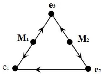 Since the mapping tournaments $V_{1}$ and $V_{2}$ which are shown in Figure 1 differ in the directions on two edges, i.e. the directions on two edges connecting the vertices $e_{1}$ and $e_{3}$, $e_{2}$ and $e_{3}$ are opposite, and the direction connecting the vertices $e_{1}$ and $e_{2}$ coincide, then in the end we get one more fixed point on two edges $\Gamma_{13}$ and $\Gamma_{23}$. In order to determine the coordinates of these points, we take a narrowing of the composition of these mappings to these edges. For example, to find the location (coordinate) of a point belonging to the edge $\Gamma_{13}$, we take the contraction of the compositional operator on this edge: