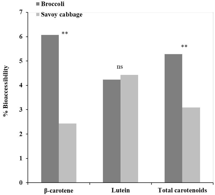 Figure 2: Bioaccessibility percentage of $\beta$ -carotene, lutein and total carotenoids in broccoli and Savoy cabbage. $(^{**})$ means significantly differences among the values $(p < 0.01)$; (ns) means not significantly differences among the values $(p < 0.01)$