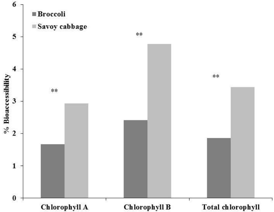 Figure 3 shows the bioaccessibility percentages of chlorophyll A, chlorophyll B and total chlorophyll for broccoli and Savoy cabbage. The values are statistically higher for Savoy cabbage, with chlorophyll B having the highest percentage of bioaccessibility (approximately $5\%$ ).