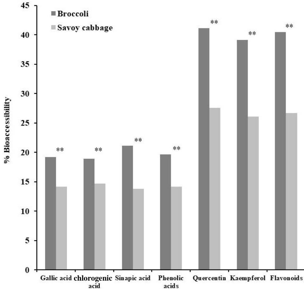 The individual phenolic acid with the highest bioaccessible content in broccoli was chlorogenic acid (0.350 mg chlorogenic acid/100 g FW), followed by synaptic acid and finally gallic acid, while in Savoy cabbage, synaptic acid exhibited the highest concentration (0.180 mg/100 g pf) after gastrointestinal digestion in vitro. Comparing the two brassicas studied, broccoli 'Parthenon' presented the highest content of all individual phenolic acids in the bioaccessible fraction. Regarding the flavonoids quercetin and kaempferol, the bioaccessible content was also higher in broccoli, as was the case in the undigested sample. The most abundant individual flavonoid in broccoli, after gastrointestinal digestion in vitro, was quercetin (2.64 mg quercetin/100 g FW) while in Savoy cabbage it was kaempferol (0.460 mg kaempferol/100 g FW.