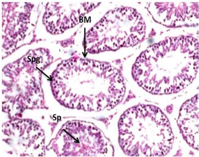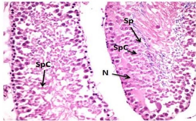 Mancozeb manganese ethylene bis dithiocarbamate polymeric complex -with zinc salts is a very important protective non-systemic fungicide, classified as an ethylene bis dithiocarbamate fungicide. Mancozeb used for controlling fungal diseases for a wide variety of crops because of its broad-spectrum as fungicidal effects and high compatibility with agrochemicals. The objective of this study was to investigate the results of the fungicide mancozeb at different doses on some biochemical parameters, reproductive performance, and histological changes in testes and thyroid gland. The low amount equals 1/7 of LD 50 manczeb-d 1 , and the high amount equals 1/3.5 of LD 50 mancozeb-d 1 . Amounts of mancozeb (mancozeb-d1 and mancozeb-d 2 ) adjusted according to the rat’s body weights. The results showed that mancozeb decreased plasma testosterone level, sperm count, viability, motility, and significantly (P