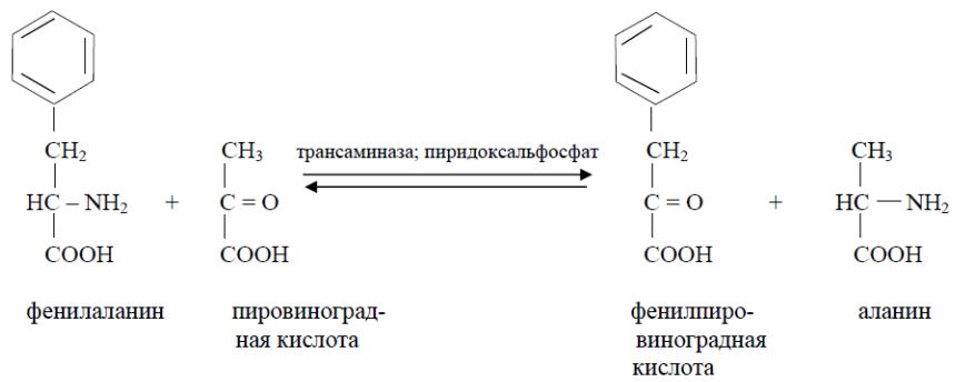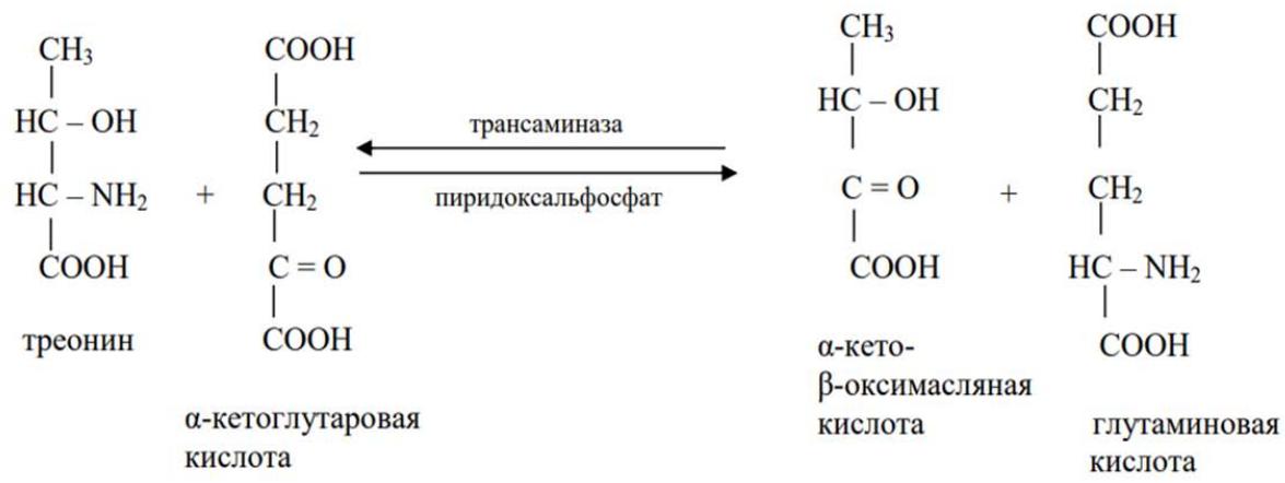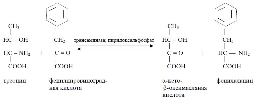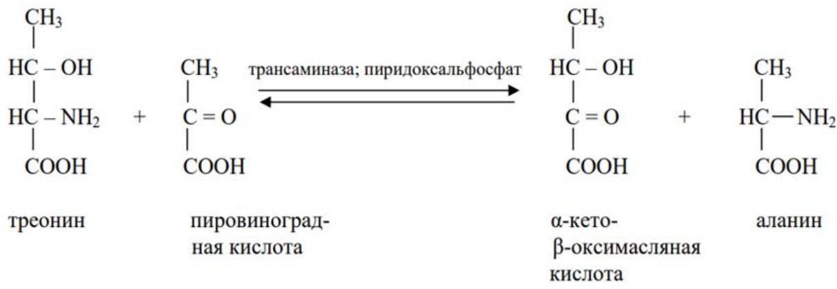 T.T. Bepezov в своей монографии в 1969 г. указал как на доказанный факт, что в тканях мlekопитающих механизм переаминирования является и главным путем дезаминирования L-аминокислот и перечисляет все аминокислоты, участвующие в этом процессе [16]. Среди аминокислот T.T. Bepezov называет треонин, но не называет лизин, следовательно, он имеет в виду сами аминокислоты, а не продукты их превращения, потому что продукт превращения лизина — α-аминодиппиновая кислота — активно подвергается переаминированию. T.T. Bepezov в своей работе [16] также отмечает, что переаминирование может происходить в тканях между разнообразными монокарбоновыми донорами и акцепторами аминогрупп без участия дикарбоновых аминокислот. К реакциям этого типа относятся процессы переаминирования между рядом аминокислот и пировиноградной кислотой с образованием алианина и соответствующих α-кетокислот, протекающие в митохондриях. Была показана и обратимость этих реакций, а также различная способность отдельных тканей катализировать описанные превращения. Дальнейшие исследования подтверждают возможность переаминирования треонина у крыс. Так, в работе Noguchi T. et al. [17] рассматривается фермент серин-пируватаминотрансфераза, выделяемый из митохондрий печени крыс и катализирующий переаминирование различных аминокислот как с пировиноградной, так и с фениллировиноградной кислотой. Причем если фениллиранция весьма активно переаминируется серин-пируватаминотрансферазой с пировиноградной кислотой, то лейцин (в большой степени), треонин (в меньшей степени) и глицин (в очень малой степени) переаминируются ею только с фениллировиноградной кислотой (схема 1).