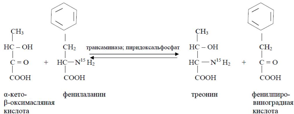 В работе Ishikawa et al. [18] устанавливается идентичность кинурунинаминотрансферазы почек и мозга крыс. Что касается субстратной специфичности обоих ферментов, то кроме кинурунинна (продукт распада триптофана), они способны катализировать переаминирование многих аминокислот как с пирониноградной, так и с фениллировиноградной кислотами. Однако если кинурунинаминотрансфераза мозга хорошо пераминирует почти все аминокислоты, то фениллировиноградной кинурунинаминотрансферазы почек не пераминирует с ней некоторые аминокислоты. Тренин пераминируется с фениллировиноградной кислотой обеими кинурунинаминотрансферазами, но в почках в небольшой степени, а в мозге так же активно, как и другие аминокислоты, уступая лишь метионину. С пирониноградной кислотой обе кинурунинаминотрансферазы пераминируют только ароматические аминокислоты. На лизин обе кинурунинаминотрансферазы не действуют, что подтверждает отсутствие у него способности к пераминированию. Следовательно, катализируемое кинурунинаминотрансферазой активное переаминирование с фениллировиноградной кислотой различных аминокислот, включая тренин, подтверждается мысль Т.Т.Березова, о том, что в тканях мелекопитающих оно является главным путем дезаминирования L-аминокислот [16]. Barret [19] отмечает, что мелекопитающим, большим уремией и находящимся на низкобелковой диете, давали α-кетокислоты — производные незаменимых аминокислот. Последние синтезировались в организме путем пераминирования. Оказалось, что в виде аминокислот необходимо давать только лизин, для которого отсутствует трансаминаза. В то же время степень использования α-кетокислот для синтеза соответствующих аминокислот различается. Валин, лейцин, изолейцин, метионин и фенилаланин быстро синтезировались путем пераминирования, в то время как гистидин, треонин и триптофан синтезировались в меньшей степени, а синтеза лизина вообще не наблюдается. В свете этого легко объясняется указанный выше следующий факт. Когда кроликов и крыс снабжали рационом с 15N меченным глицином, в тренине эта метка не включалась: в организме мелекопитающих треонин из глицина образовывался не может, а пераминирование подвергается лишь очень незначительная часть глицина. В то же время, обнаружение в треонине 15N, введенного в организм крыс с лейцином, есть результат пераминирования, которому активно подвергается лейцин и слабо подвергается треонин [19]. Следовательно, обнаружение в треонине (но не в лизине) 15N, введенного в организм крысы с лейцином, могло быть только результатом пераминирования.