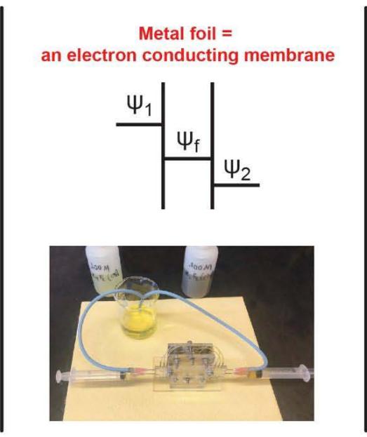 Though these membranes are easy to make and have low resistance, they are brittle. To make a system attractive for practical applications we tried simple metal foils separating in a chamber two aqueous solutions with different redox pairs and discovered that the foils behave like polyaniline membranes, i.e., they serve as membranes, ideally selective for electrons.