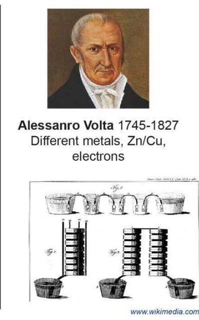 Alessandro Volta realized that the frog's leg served both as a conductor and as a detector of electricity. He also understood that the frog's legs twitching may be caused by the two different metals connected one with another and with a frog leg. When he replaced the frog's leg with a brine-soaked paper or cardboard, he detected the flow of electricity. Later, as a result of a professional disagreement over advocated by Galvani mechanism, in 1800 Volta invented the first electric battery, now known as a voltaic pile. Its original may be found in the Volta temple in Como, near Milan. Volta also demonstrated that an effective and easily available pair of dissimilar metals to produce electricity was zinc and copper [3].