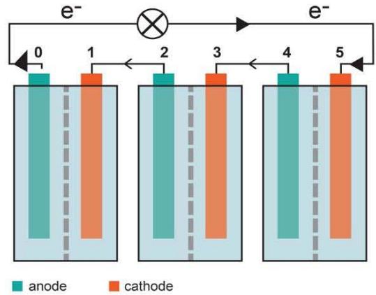 One could say that now we have classical electrochemical cells in series where one surface of each foil serves as an anode in one cell and another surface of the same foil serves as a cathode in the next cell. This interpretation is different to the starting from Volta situation where two electrodes in electrochemical cell are separated by an electrolyte with ionic conductivity. Moreover, in addition to ionic conductivity of an electrolyte in a classical electrochemical cell, in the new electrochemical cell there is a step with electron-based conductivity. Electrons are moving through the foil from a surface in contact with a reducing agent to a surface in contact with an oxidant. This leads to charge separation and the formation of a difference in electric potentials between these two solutions.