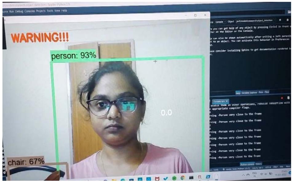 The suggested system is focused on object detection. The technology has been designed to be wearable and portable. The system is attached to the person's chest. The video of the scene is captured by the Raspberry Pi camera, which is then translated into frames by the processor. The auditory output from the system directs the user to the object. Figure 6 depicts the detection of an object (blue cell phone) and a person. A chair is spotted with a person in Figure 7. The system outputs the object's name as well as the object's likelihood as a percentage. As a result, the system will only detect items with a probability larger than the set threshold. Because You Only Look Once (YOLO) is employed to implement the system on the Android platform, the accuracy of object recognition is reduced. It shows the object's name as well as its probability. Through the device's speakers, the programme also informs the user of the class designation and the distance between the object and the camera.