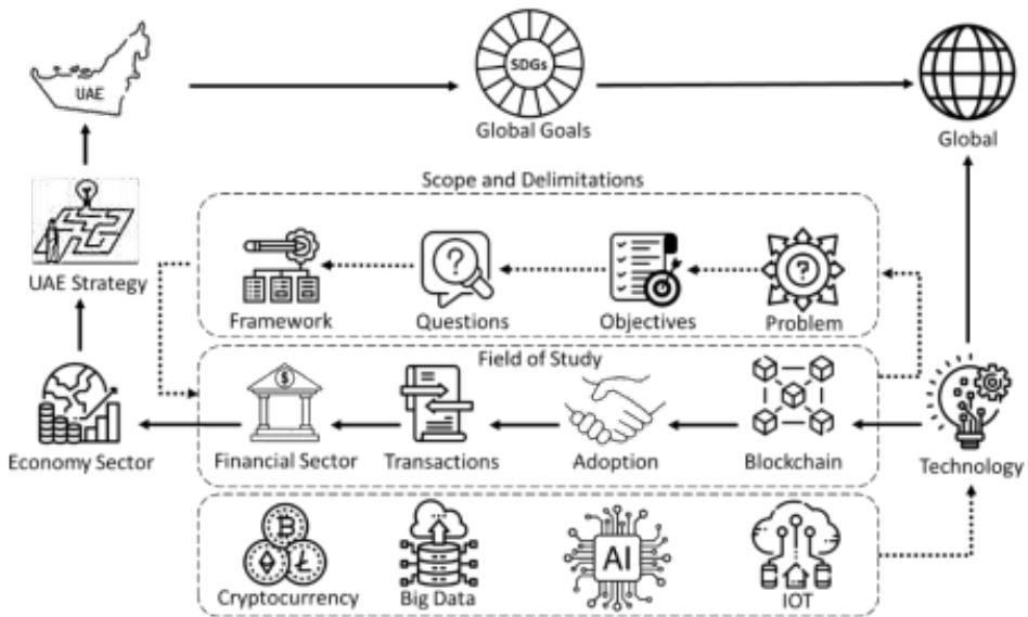 To provide a clearer understanding of how blockchain aligns with global objectives and integrates into urban strategies, Figure 1 illustrates the framework connecting the UAE's blockchain adoption initiatives with Sustainable Development Goals (SDGs). The diagram emphasizes the interplay between technology, the financial sector, and key components such as cryptocurrency, big data, and IoT in shaping sustainable smart cities.