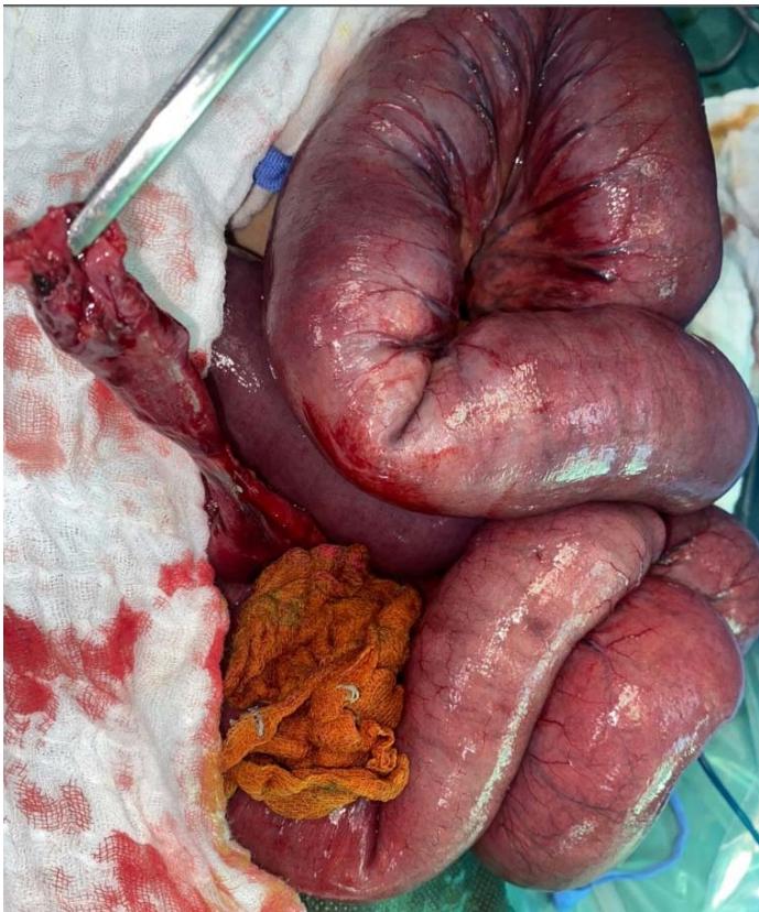 He was referred to our emergency, he had symptoms of intestinal obstruction: he couldn't have a pass gas, he noticed stomach pain and a swollen belly. He had no external gastrointestinal bleeding.