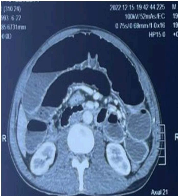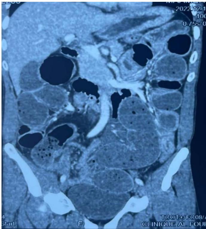 Abdominal CT scan showed small and large bowel distention with a caliber disparity in the right iliac fossa and air-fluid levels.