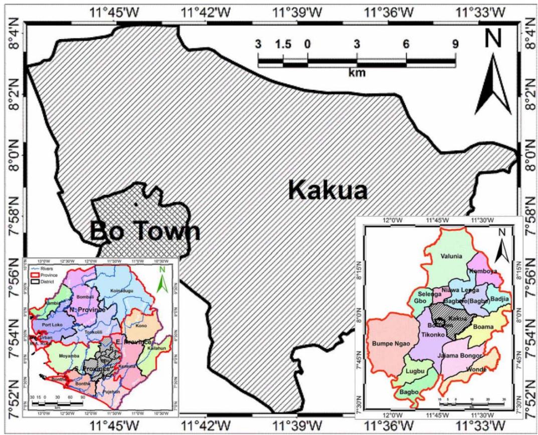 Fig. 1: A map of Sierra Leone (inset on left) depicting Bo District (in stripes), a map of the district (inset on right) depicting Kakua Chiefdom (in strips), and then the main map depicting Kakua Chiefdom and Bo township (the study area).